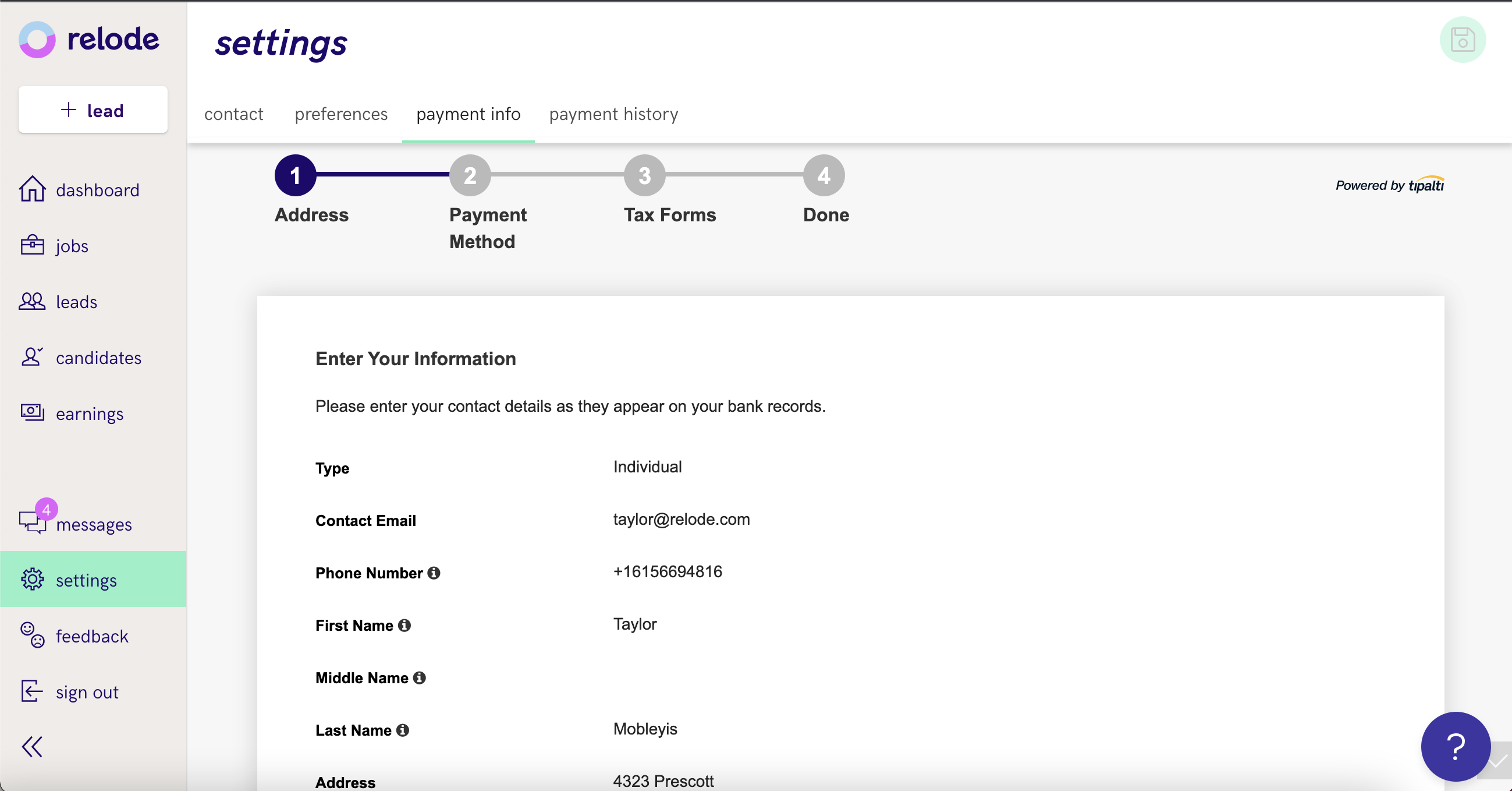 If you ever need to modify items like your current address or change your tax registration details from filing as an individual to a company, you can edit the details within this section personally. The Relode team is unable to make those modifications for you due to the very sensitive and private information provided.